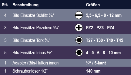 • Mit Schraubendrehereinsätzen für Schlitz-, Kreuzschlitz- und Innensechskantschrauben