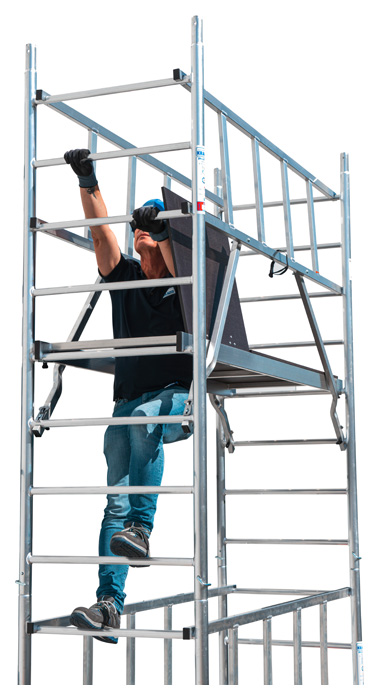 • Durch die Befestigung des Geländerrahmens GuardMatic-System vor dem Einhängen der nächsthöheren Belagbühne ist der sichere Aufbau gewährleistet.