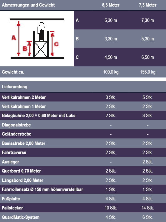 • Optimale Standsicherheit durch hochfeste Stahl-Traverse ab einer Arbeitshöhe von 4,30 m