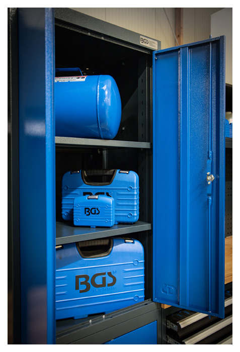 - 1 Werkstattschrank groß, 2-türig, mit 2 Fachböden, bis 80 kg belastbar
