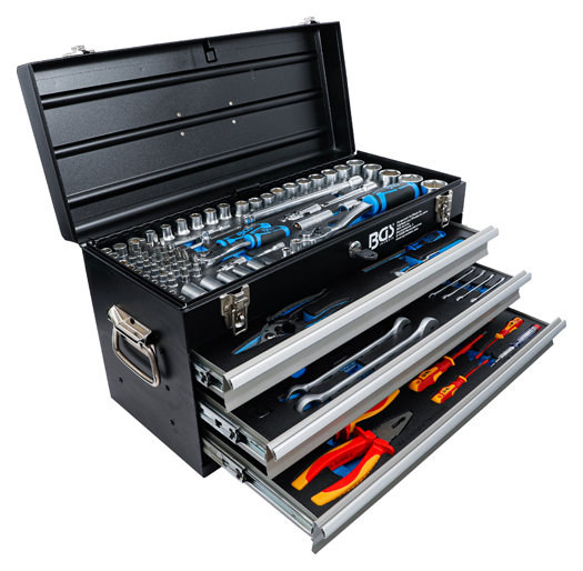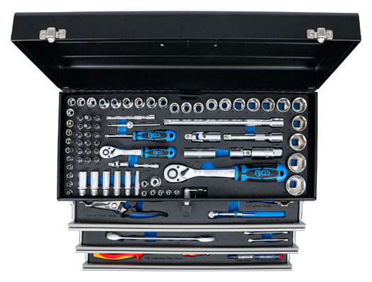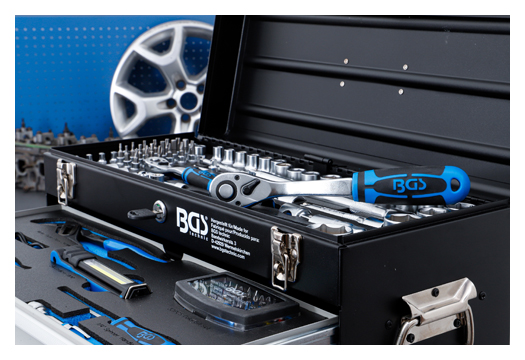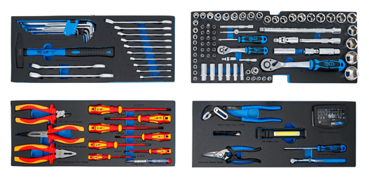 - Steckschlüssel-Einsätze, Umschaltknarren, VDE-Zangen, VDE-Schraubendreher und Maul-Ringschlüssel gefertigt aus Chrom-Vanadium Stahl
