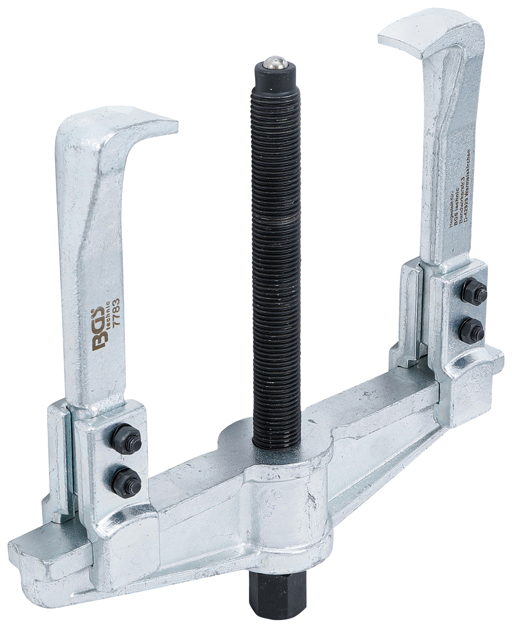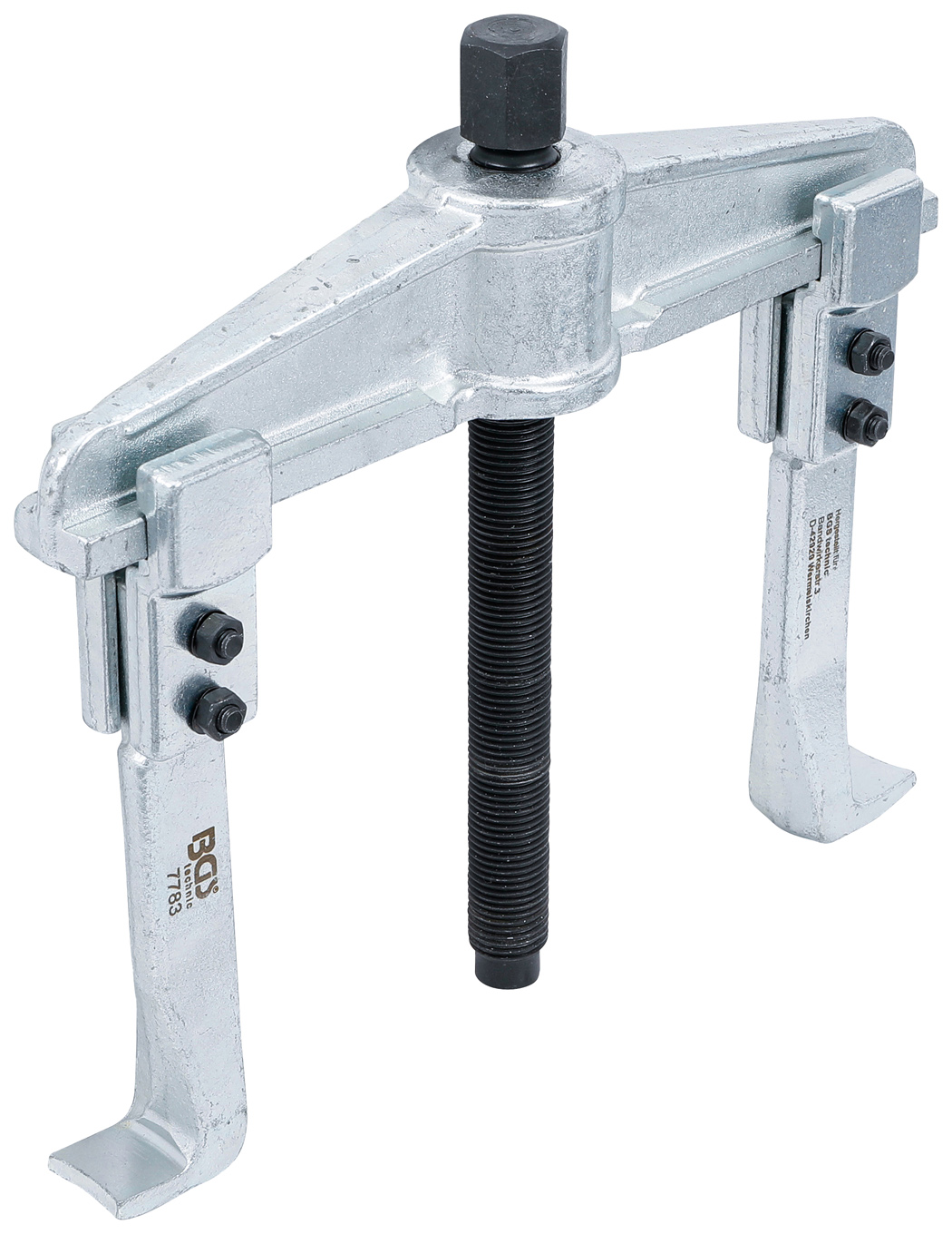Ausgestattet mit Standardhaken und einer stabilen Führung bleiben die Abzughaken in jeder Position parallel. Dadurch wird eine gleichmäßige Kraftübertragung sowie ein sicherer Sitz am Werkstück gewährleistet. Durch einfaches Umstecken der Haken kann der Abzieher sowohl für den Innenabzug als auch für den Außenabzug verwendet werden.