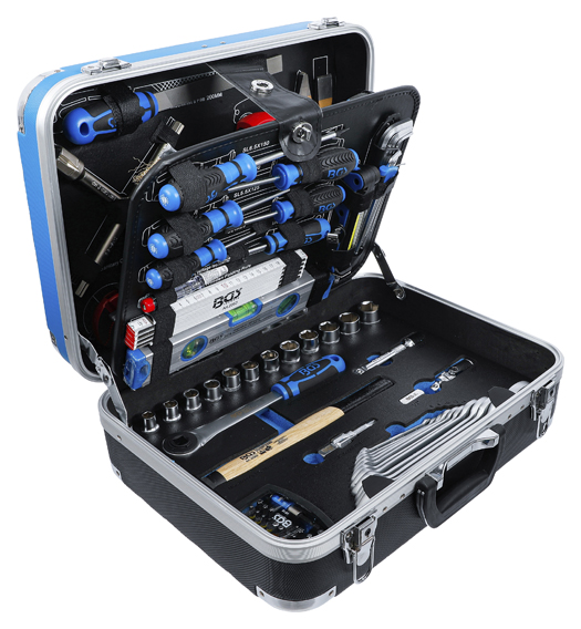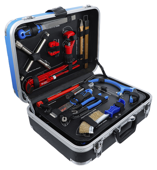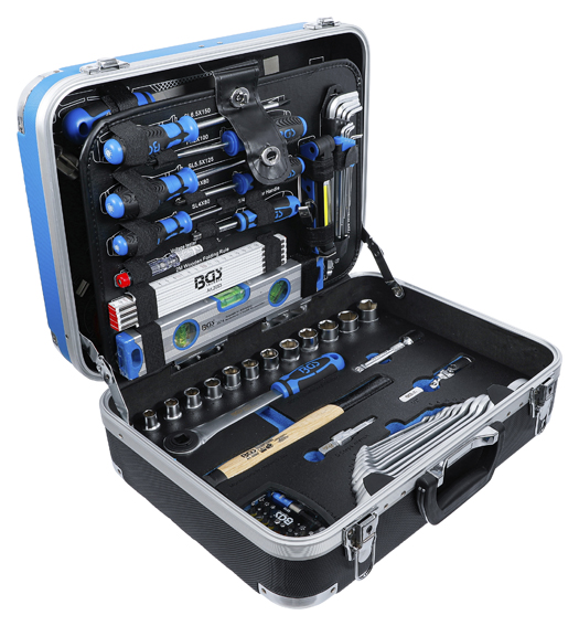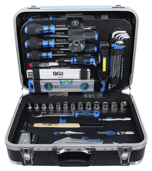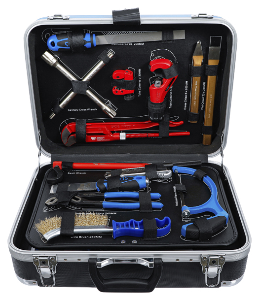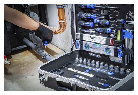 - Steckschlüssel-Einsätze, Verlängerung, Umschaltknarre, Wasserpumpenzange, Eckrohrzange und Doppel-Maulschlüssel gefertigt aus Chrom-Vanadium Stahl