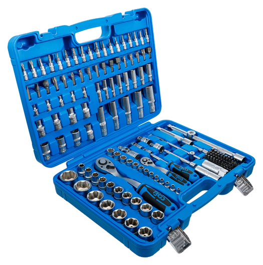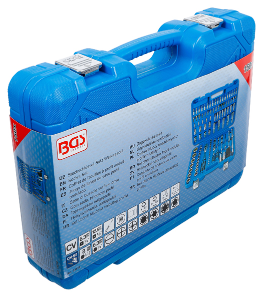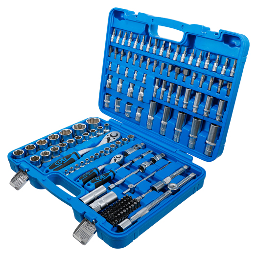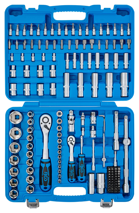 - Steckschlüssel-Einsätze, Verlängerungen, Umschaltknarren, Kardangelenke und Bit-Adapter und Drehgriff gefertigt aus Chrom-Vanadium Stahl