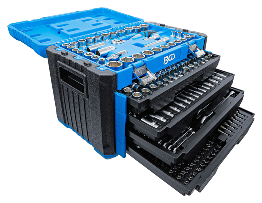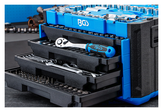 - Steckschlüssel-Einsätze, Verlängerungen, Umschaltknarren, Drehgriff und Maul-Ringschlüssel gefertigt aus Chrom-Vanadium Stahl