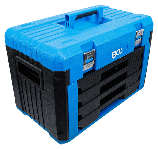 - mit 4 Kunststoff-Schubladen und einer fixierten Werkzeugeinlage im oberen Bereich