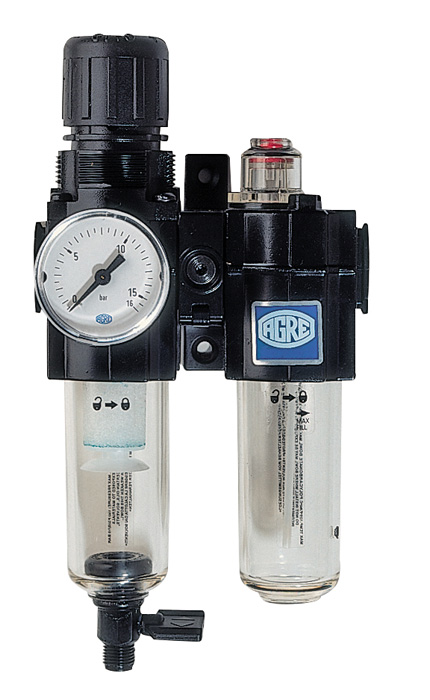 Reinigt die komprimierte Arbeitsluft von festen und flüssigen Bestandteilen (Schmutzpartikel, Kondenswasser) und schützen damit die nachfolgenden Komponenten vor Verschmutzung und Verschleiß; die Reinigung erfolgt zweistufig durch Zyklonabscheidung und Sinterfilter