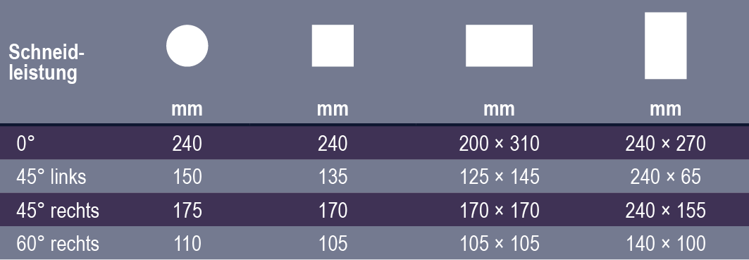 • Für Schnitte von 0° bis 60° rechts und 45° links